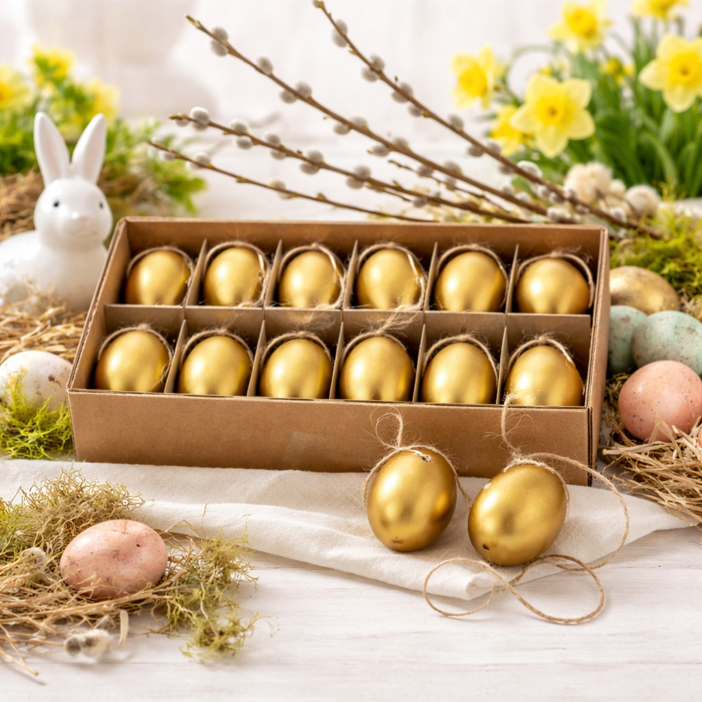 De eieren zijn voorzien van een stevig touwtje, waardoor ze eenvoudig op te hangen zijn aan paastakken, een decoratieve tak, krans of haakje. Ook los neergelegd in een schaal of op tafel zorgen ze voor een verfijnde, natuurlijke look.
