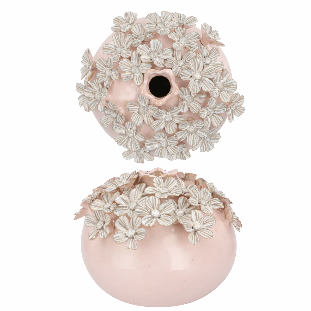 De vaas is gedecoreerd met sierlijke madeliefjes, wat zorgt voor een frisse, vrolijke uitstraling. Dankzij de zachte roze tint en het bloemrijke design past de vaas perfect in zowel moderne als landelijke interieurs.